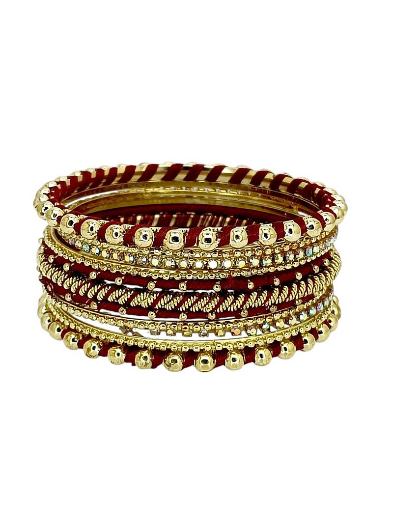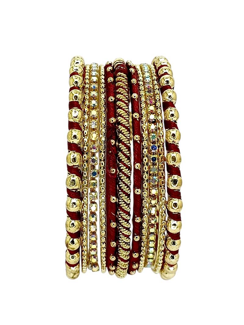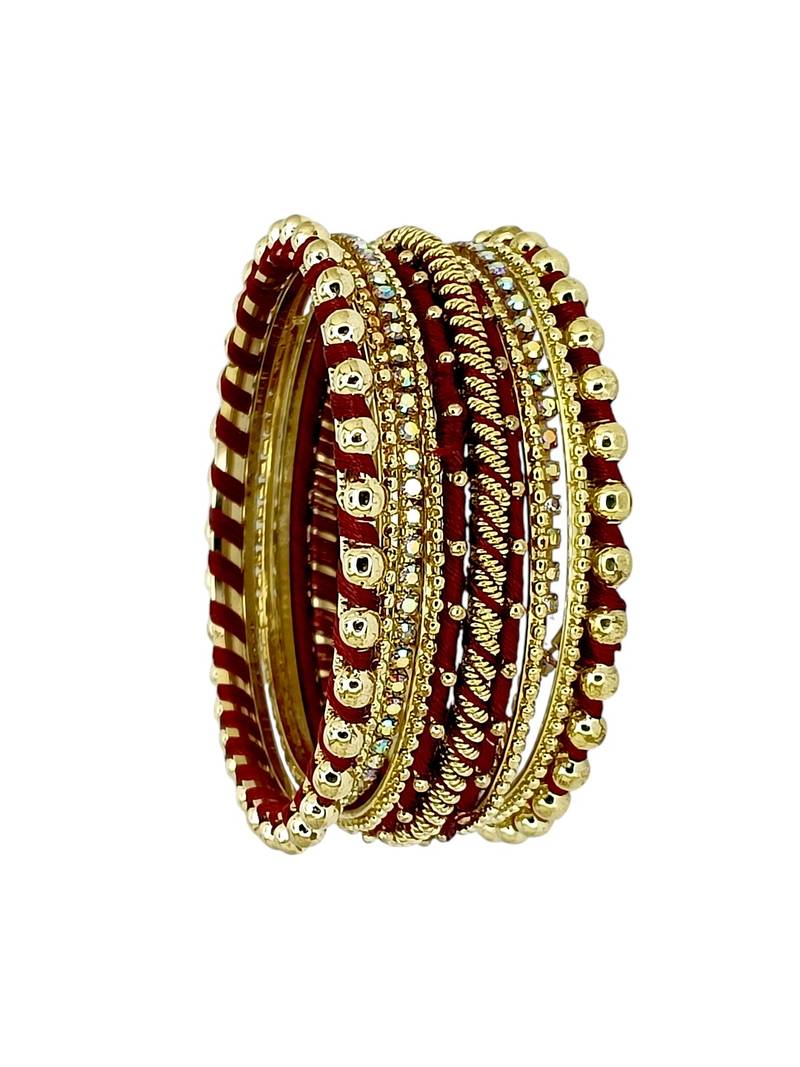 | Product Description | Set Of 11 Gold Toned Maroon Silk Thread Bangle Set, Studded With Cubic Zircon And Beads. Secured With Slip On Closure