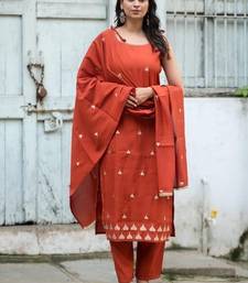 Floral embroidered pure cotton boat neck brown kurta trouser & dupatta set