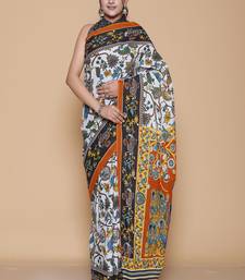 Kalamkari printed pure cotton ethnic light grey saree for woman