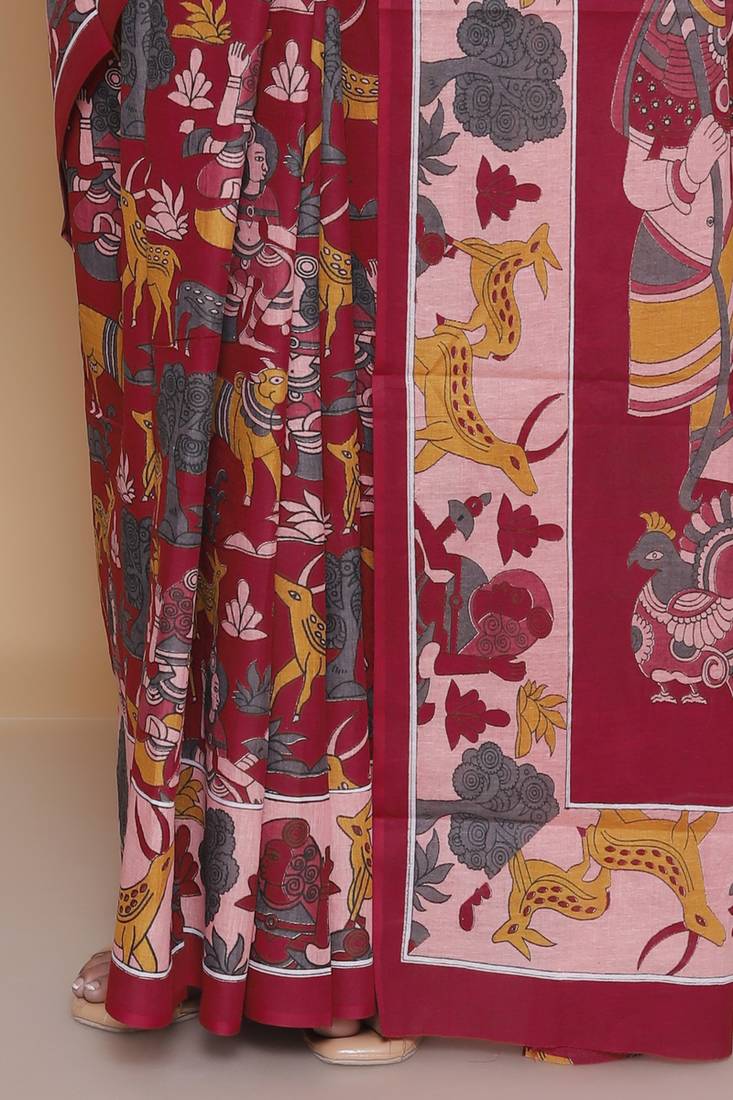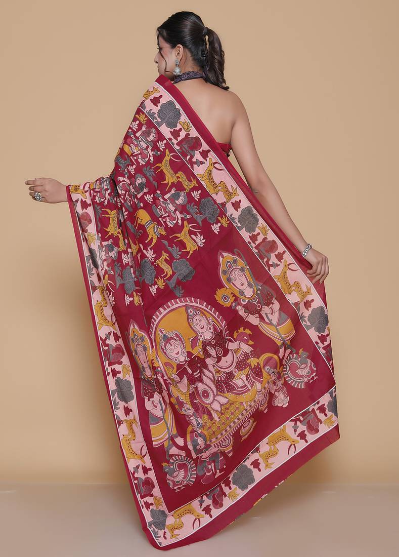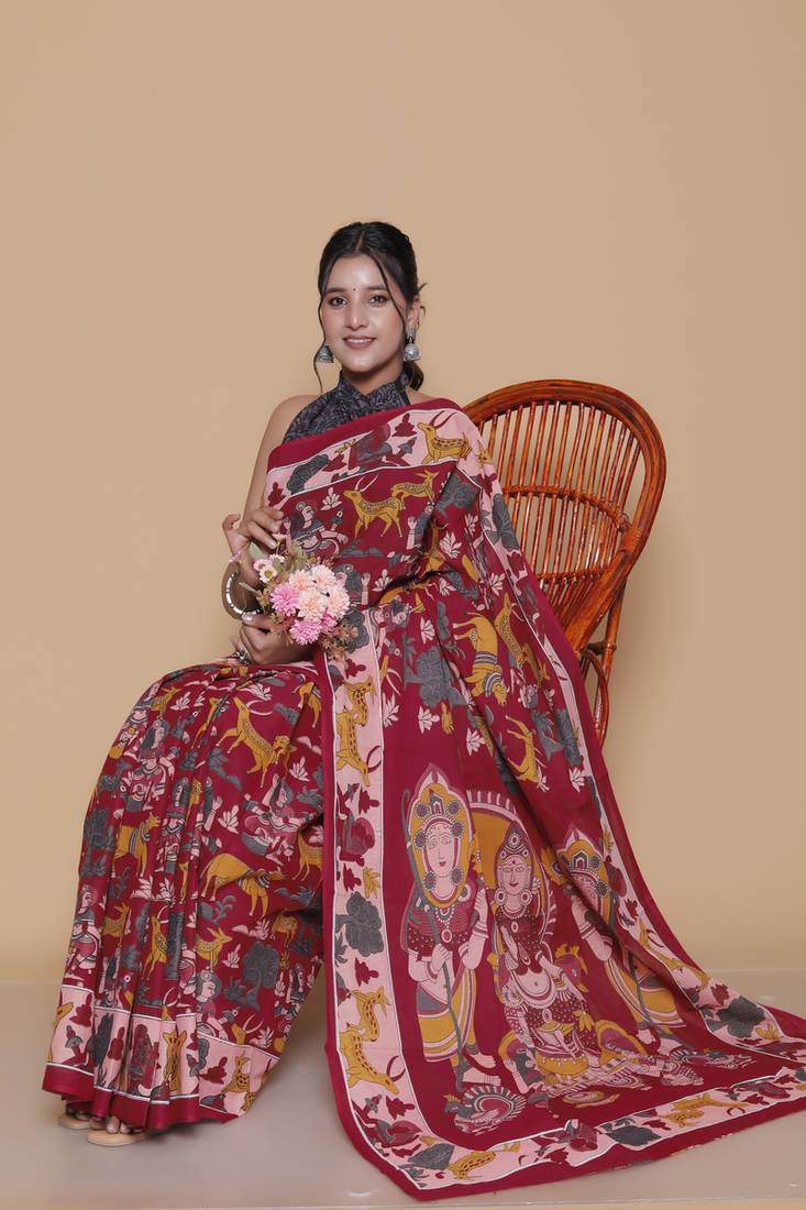 Product Name Kalamkari Printed Pure Cotton Ethnic Red Saree For Woman