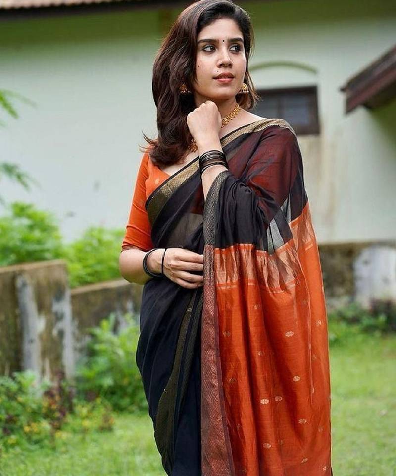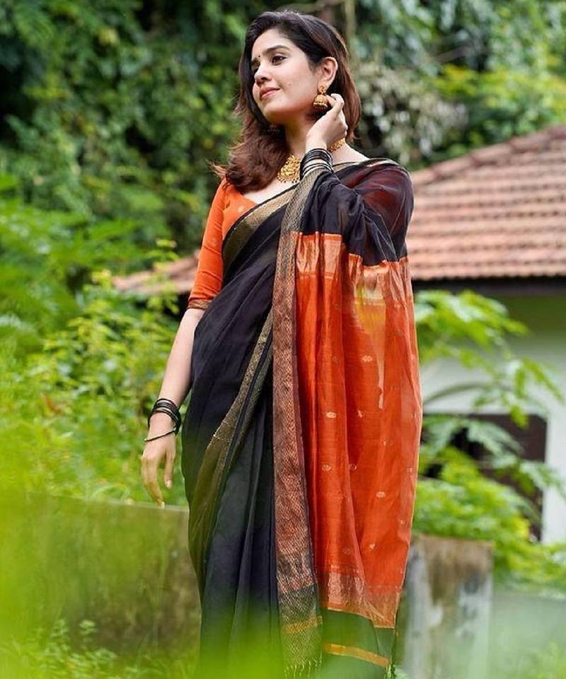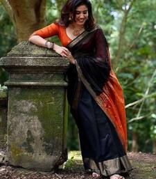 Black orange soft linen blend banarasi jacuard work designer party wear saree with unstitched blouse piece