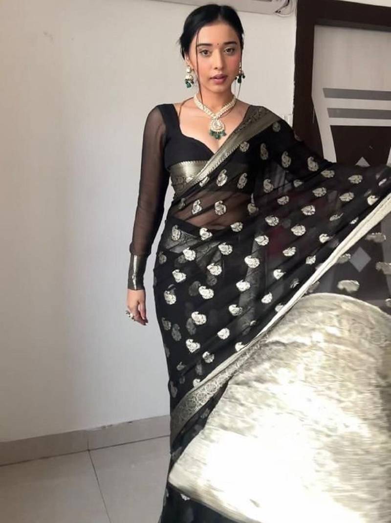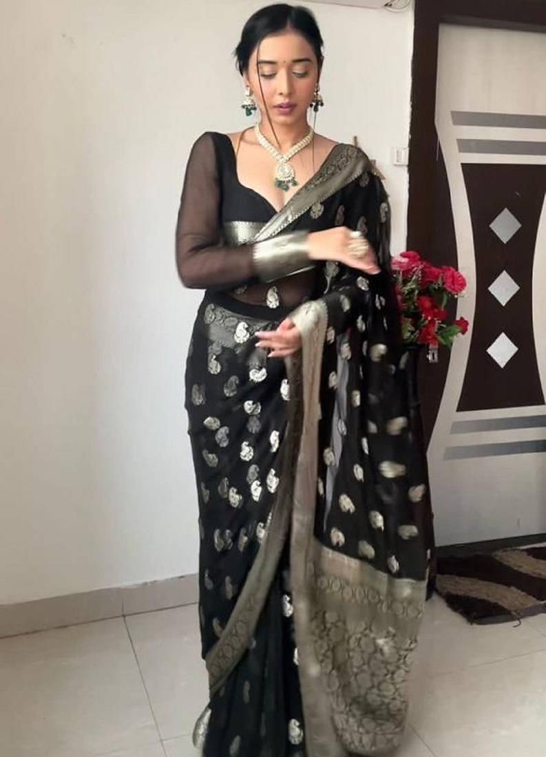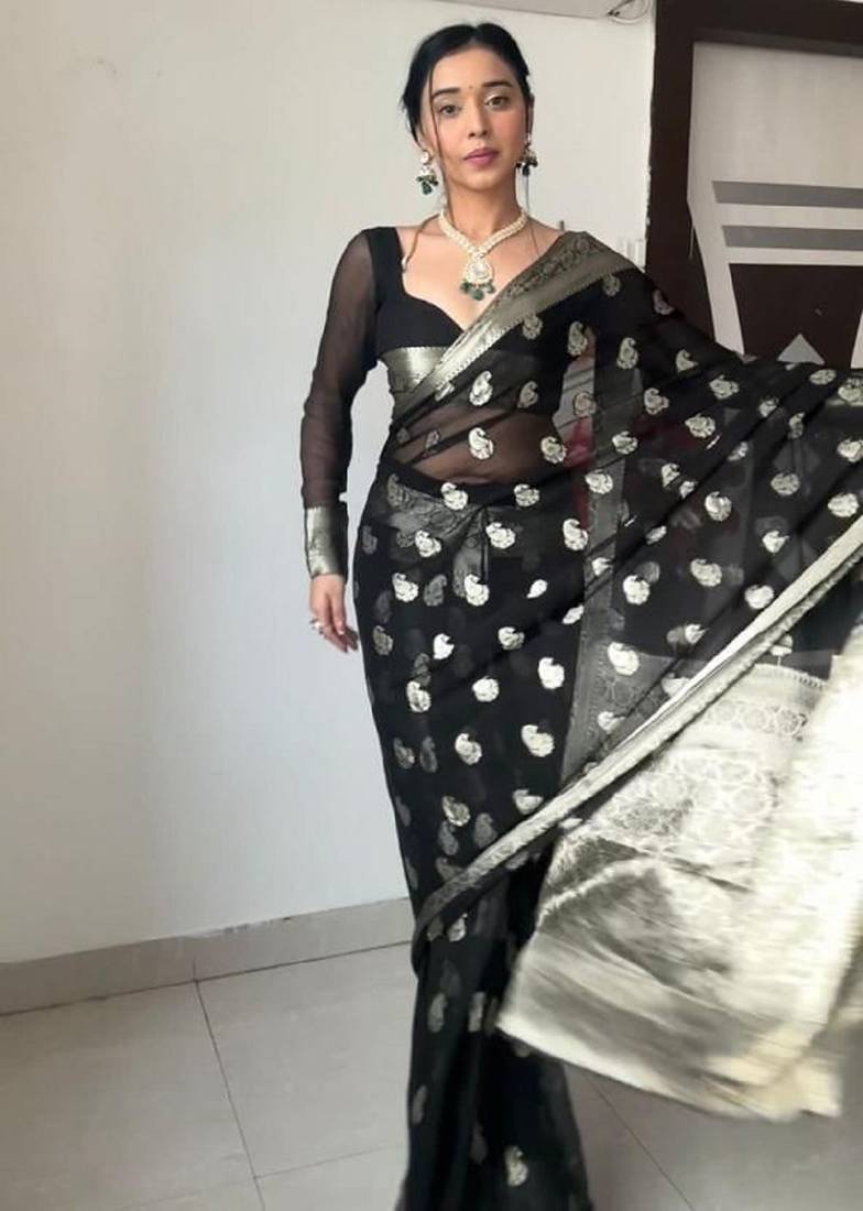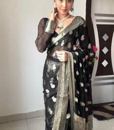 Black soft linen blend banarasi jacuard work designer party wear saree with unstitched blouse piece