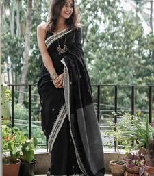 Black soft linen blend banarasi jacuard work designer party wear saree with unstitched blouse piece