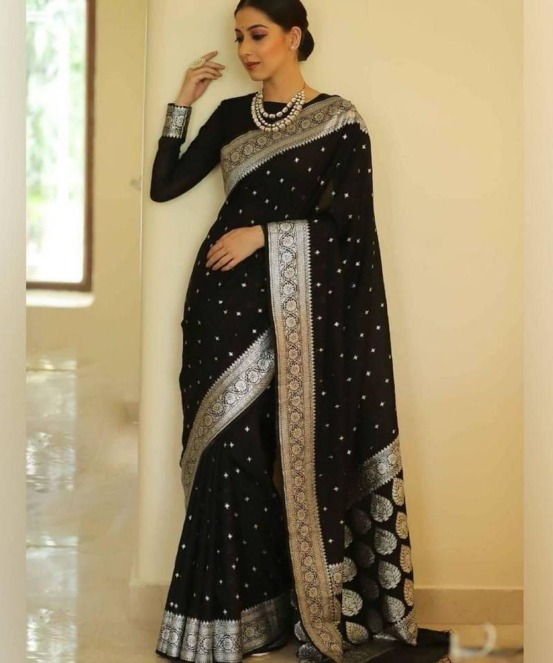 Product Name Black Soft Silk Blend Banarasi Jacuard Work Designer Party Wear Saree With Unstitched Blouse Piece
