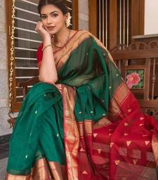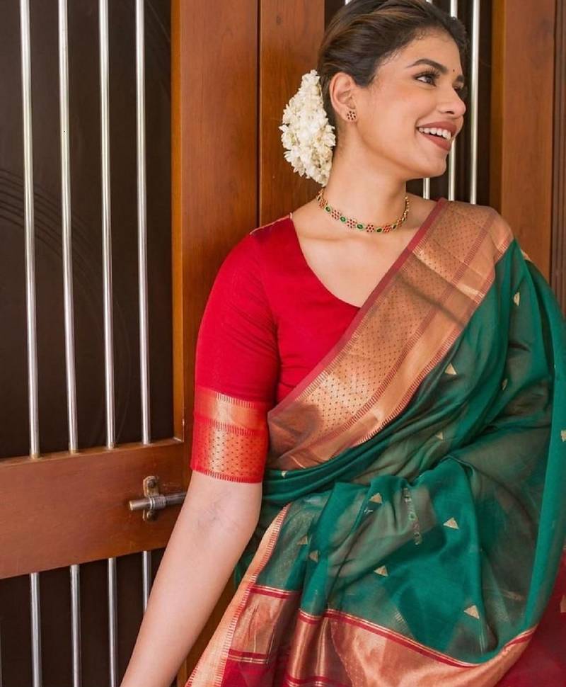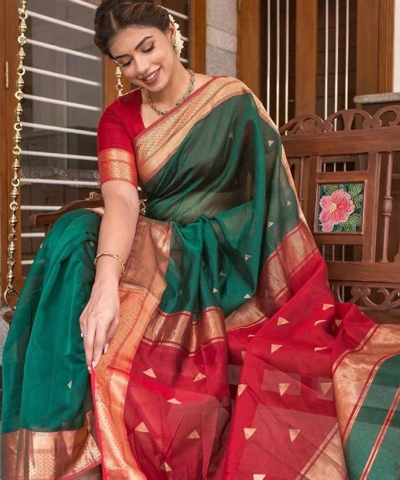 Green red soft silk blend banarasi jacuard work designer party wear saree with unstitched blouse piece