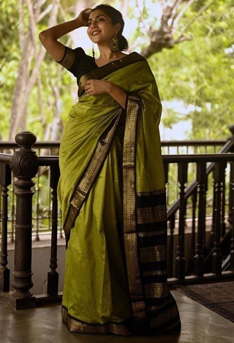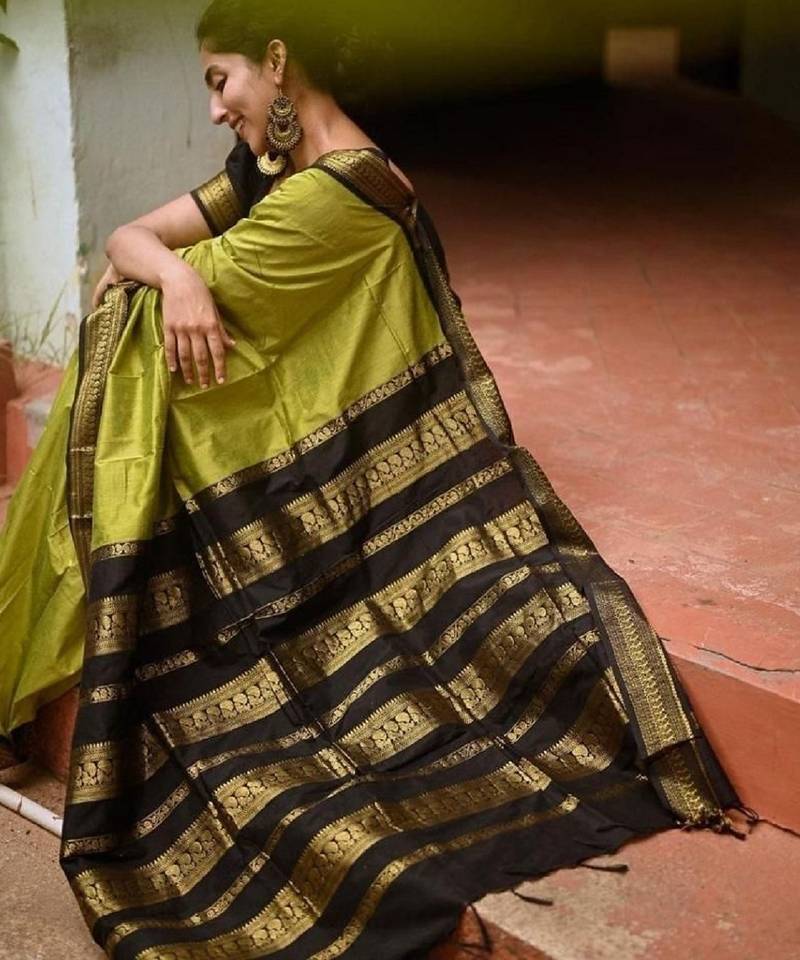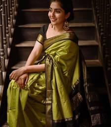 Parrot green soft silk blend banarasi jacuard work designer party wear saree with unstitched blouse piece