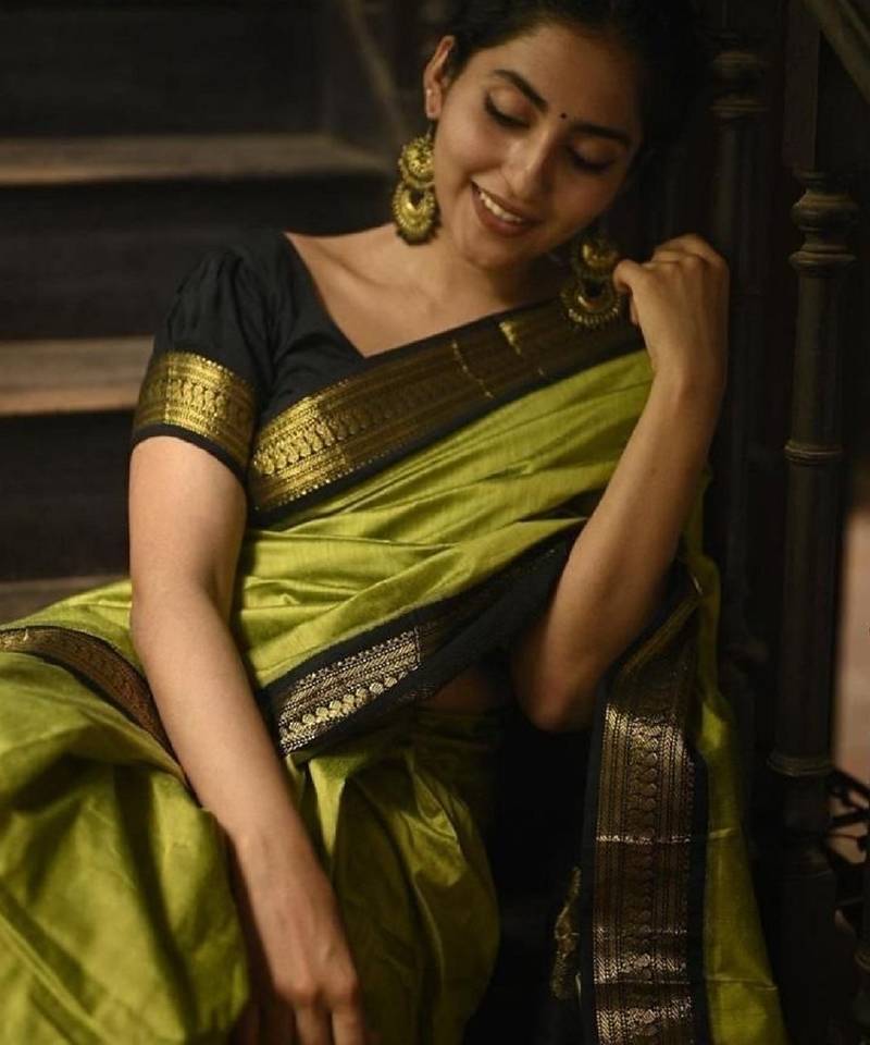 | • | Saree | : | Color- Parrot Green / Fabric- Silk Blend |