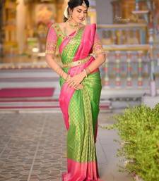 Parrot pink soft silk blend banarasi jacuard work designer party wear saree with unstitched blouse piece