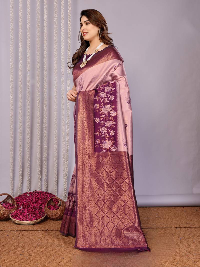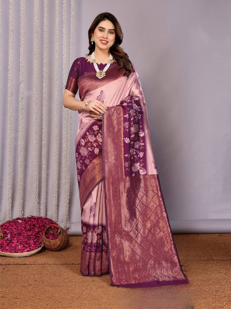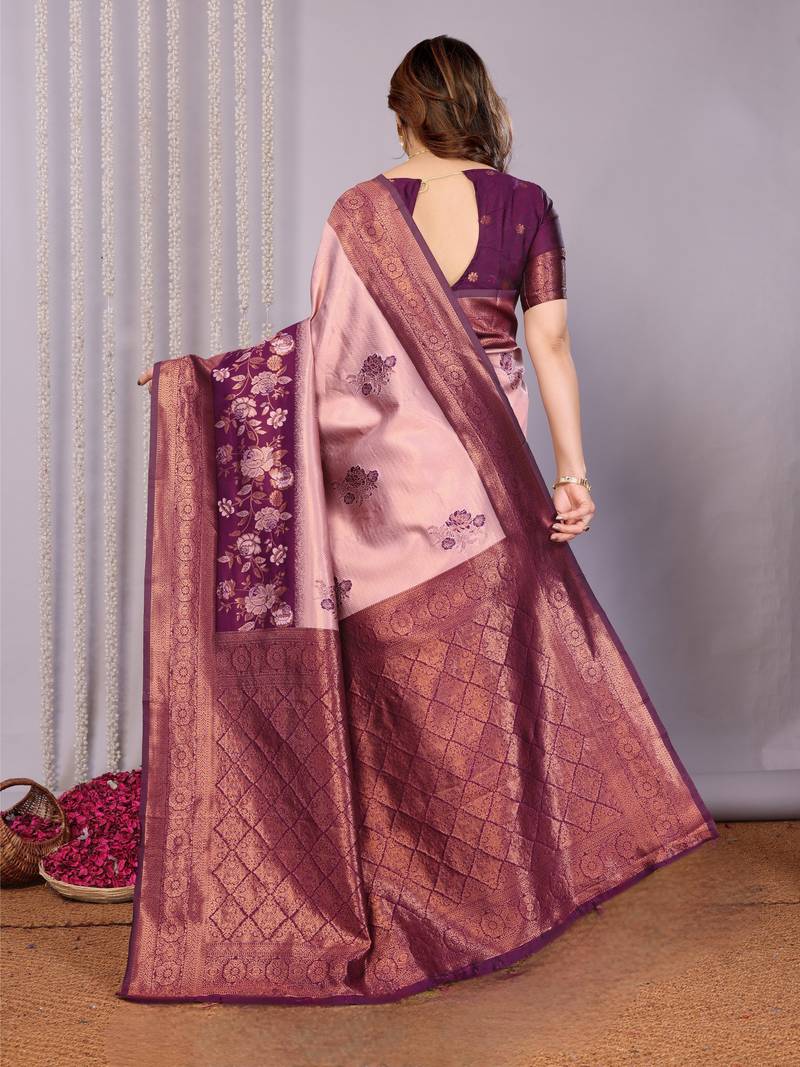 | Product Name | Peach Wine Soft Art Silk Blend Banarasi Jacuard Work Designer Party Wear Saree With Unstitched Blouse Piece | |