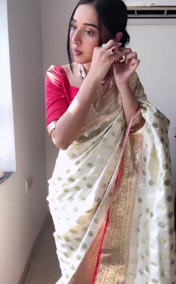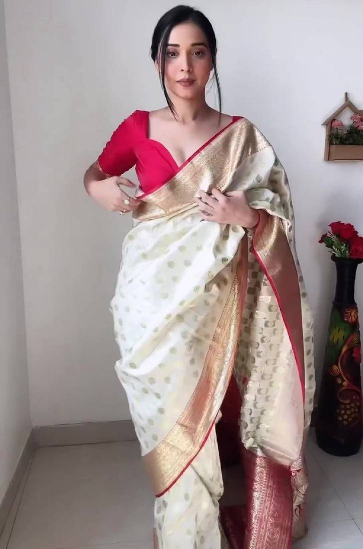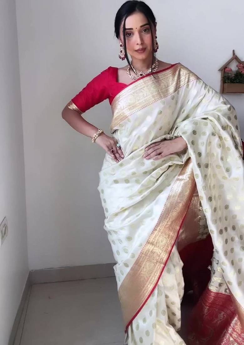 White red soft linen blend banarasi jacuard work designer party wear saree with unstitched blouse piece