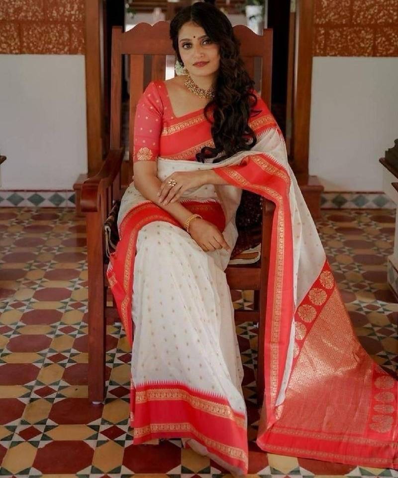Product Name White Red Soft Art Silk Banarasi Jacuard Work Designer Party Wear Saree With Unstitched Blouse Piece