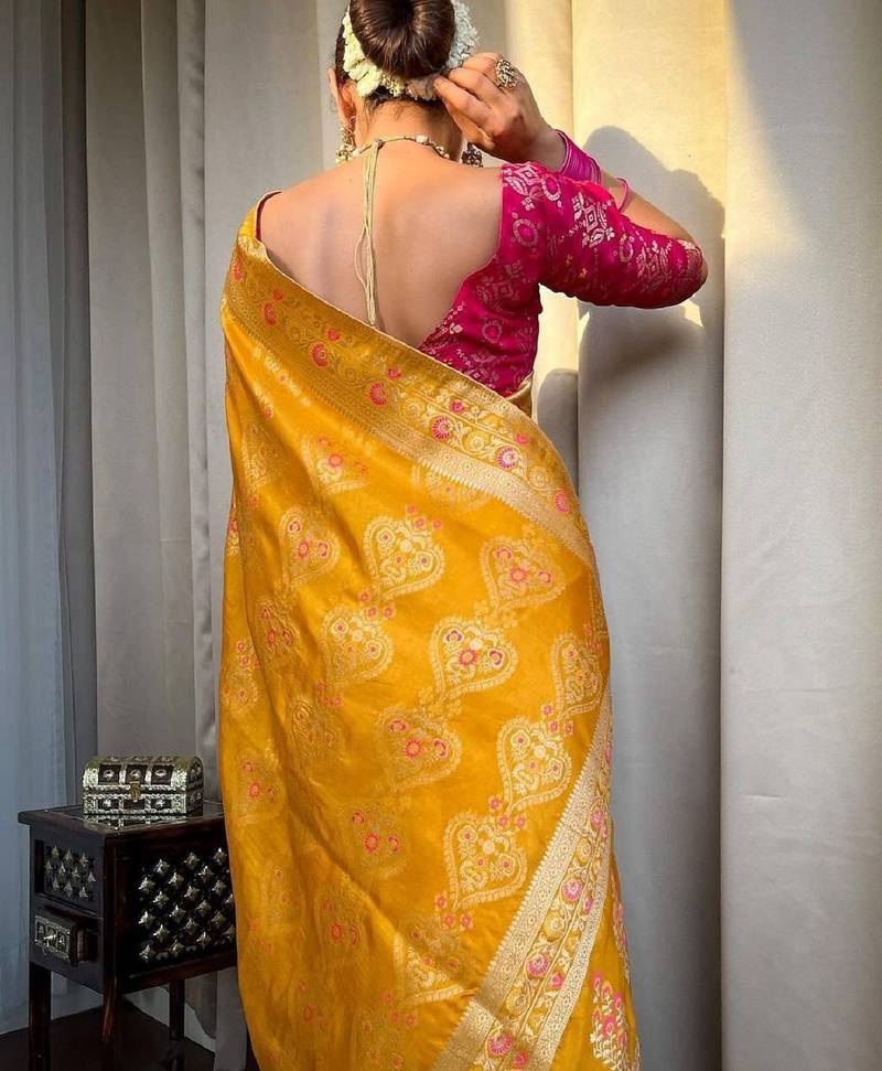 Yellow pink soft silk blend banarasi jacuard work designer party wear saree with unstitched blouse piece