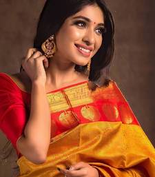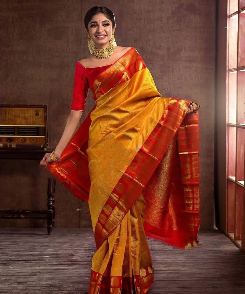 Yellow red soft silk blend banarasi jacuard work designer party wear saree with unstitched blouse piece