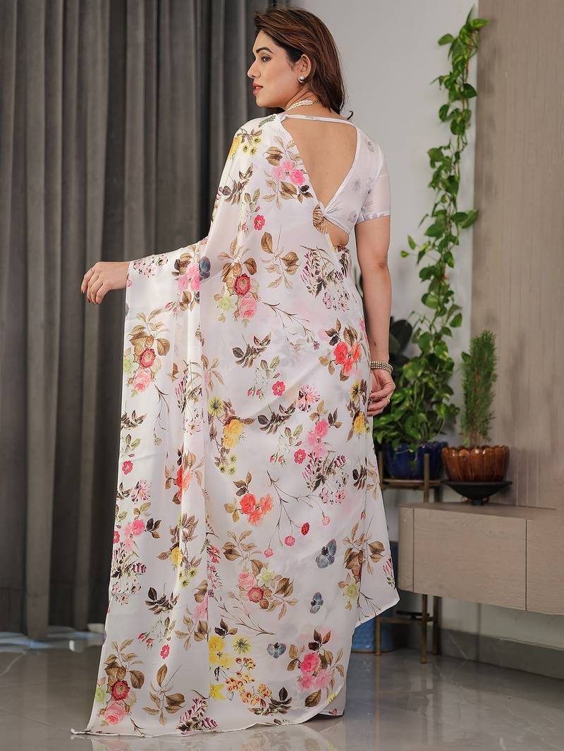 Designer floral satin georgette saree with attached blouse piece