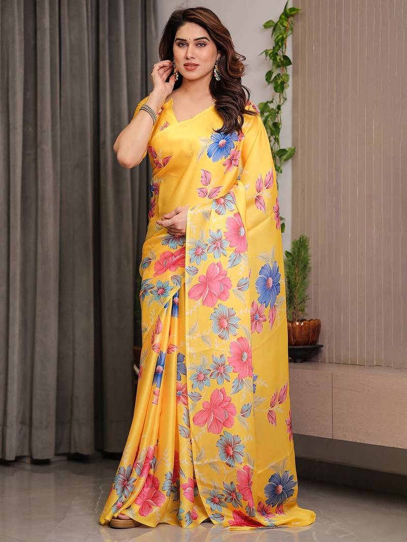 Product Name Elegant Floral Printed Satin Georgette Saree With Attached Blouse