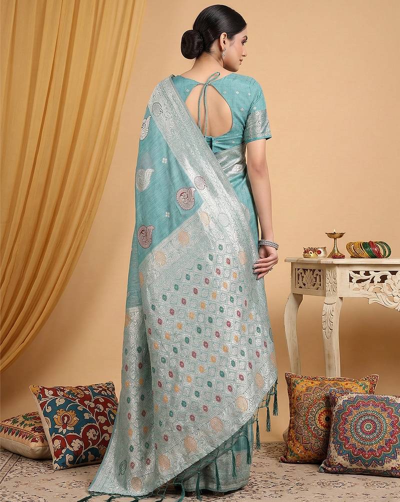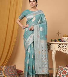 Blue linen woven work saree with blouse