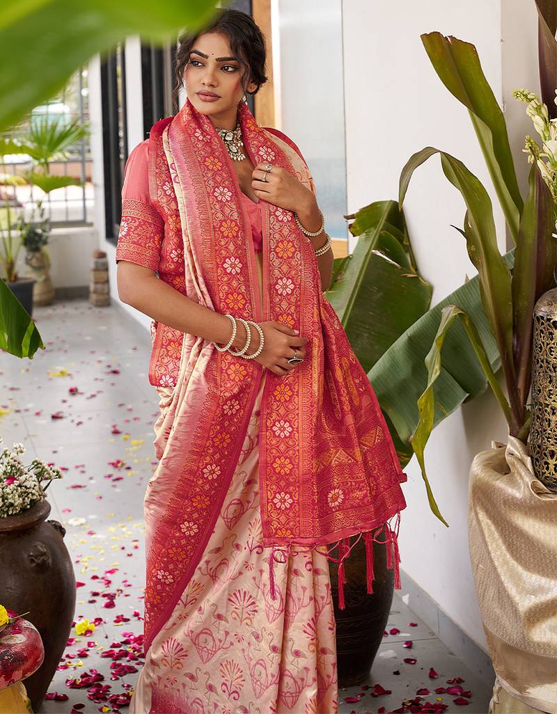 Cream silk woven saree with blouse