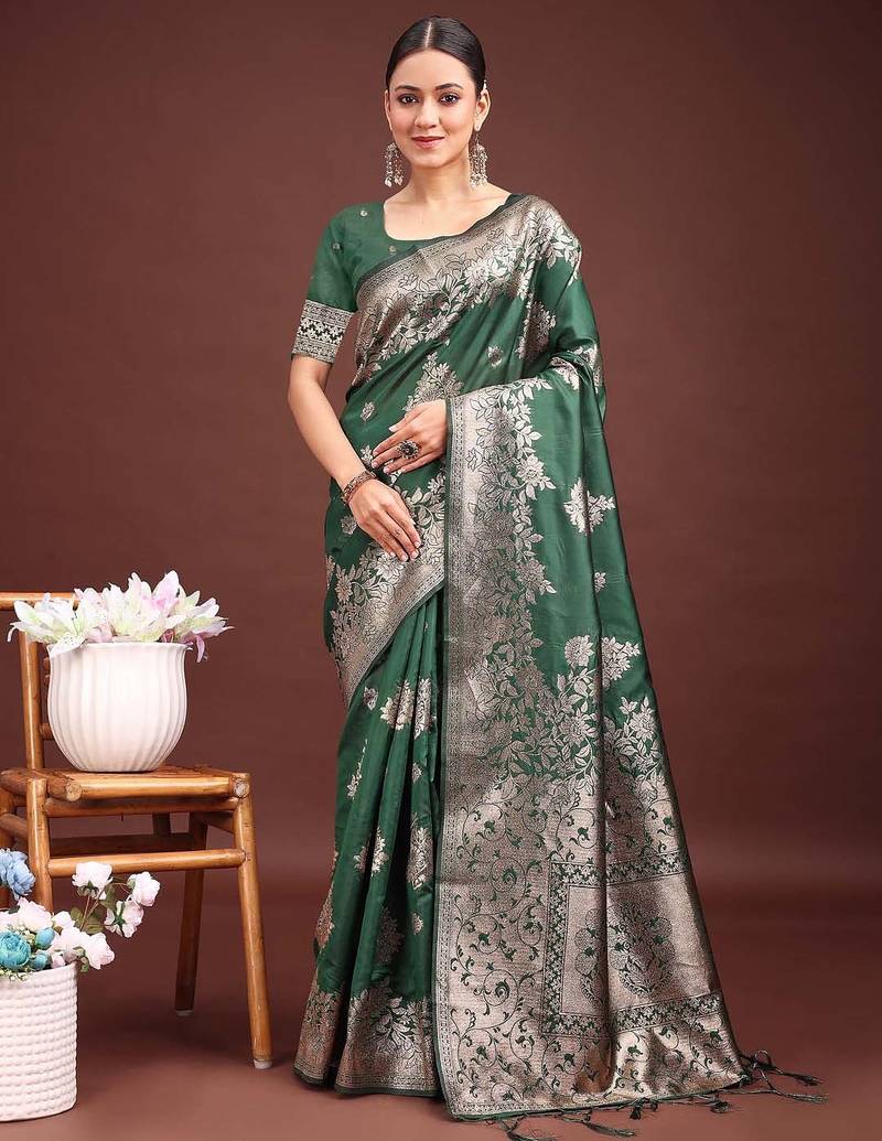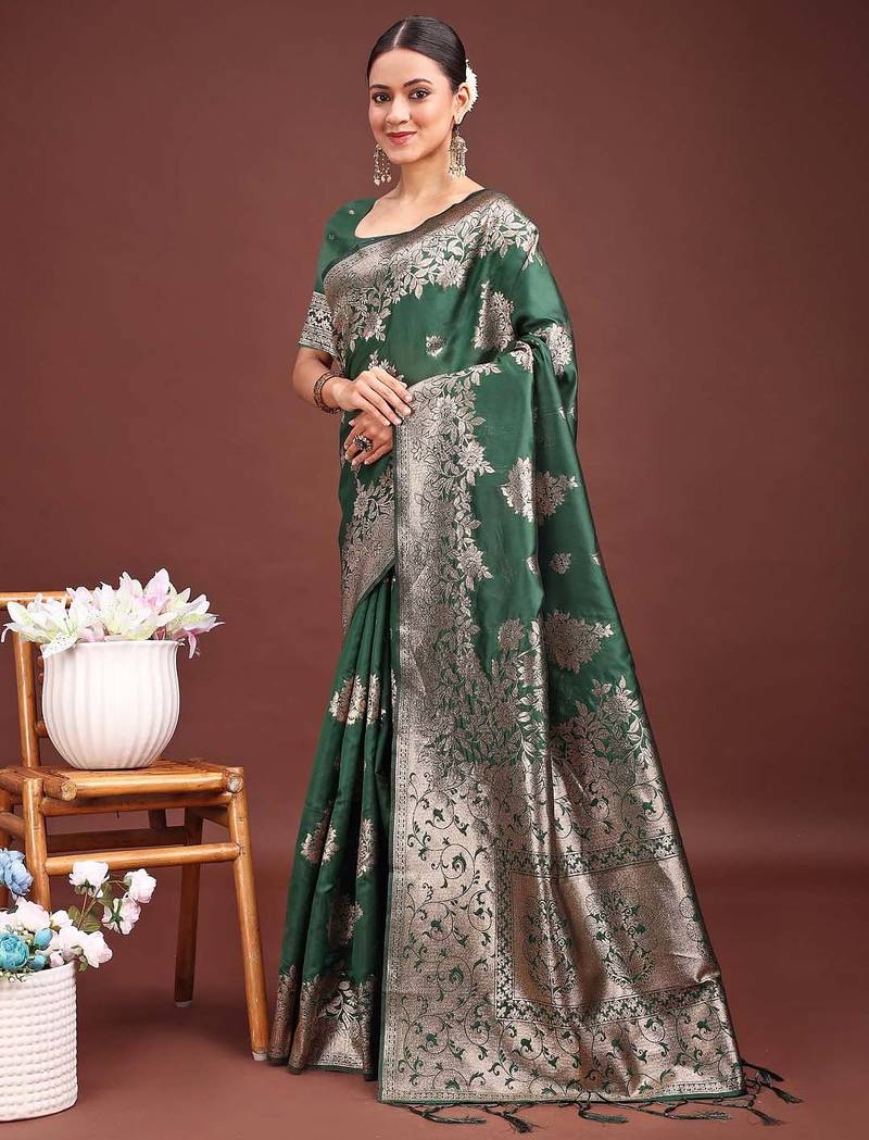 Dark green banarasi silk woven work saree with blouse