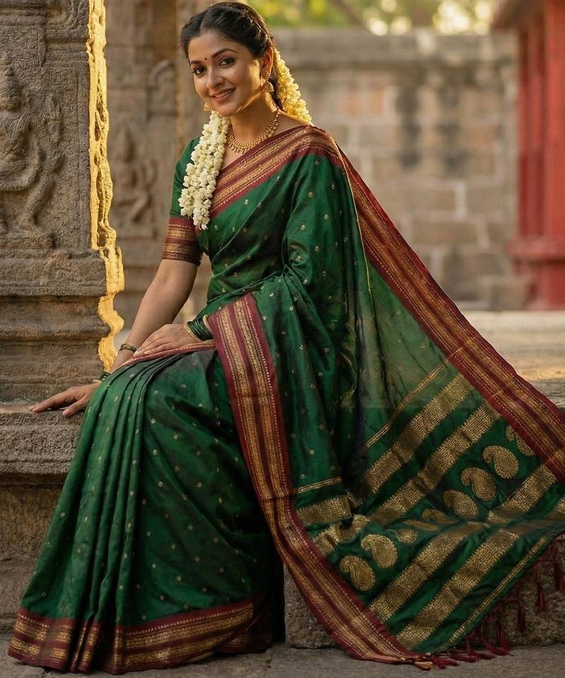 Dark green silk woven saree with blouse