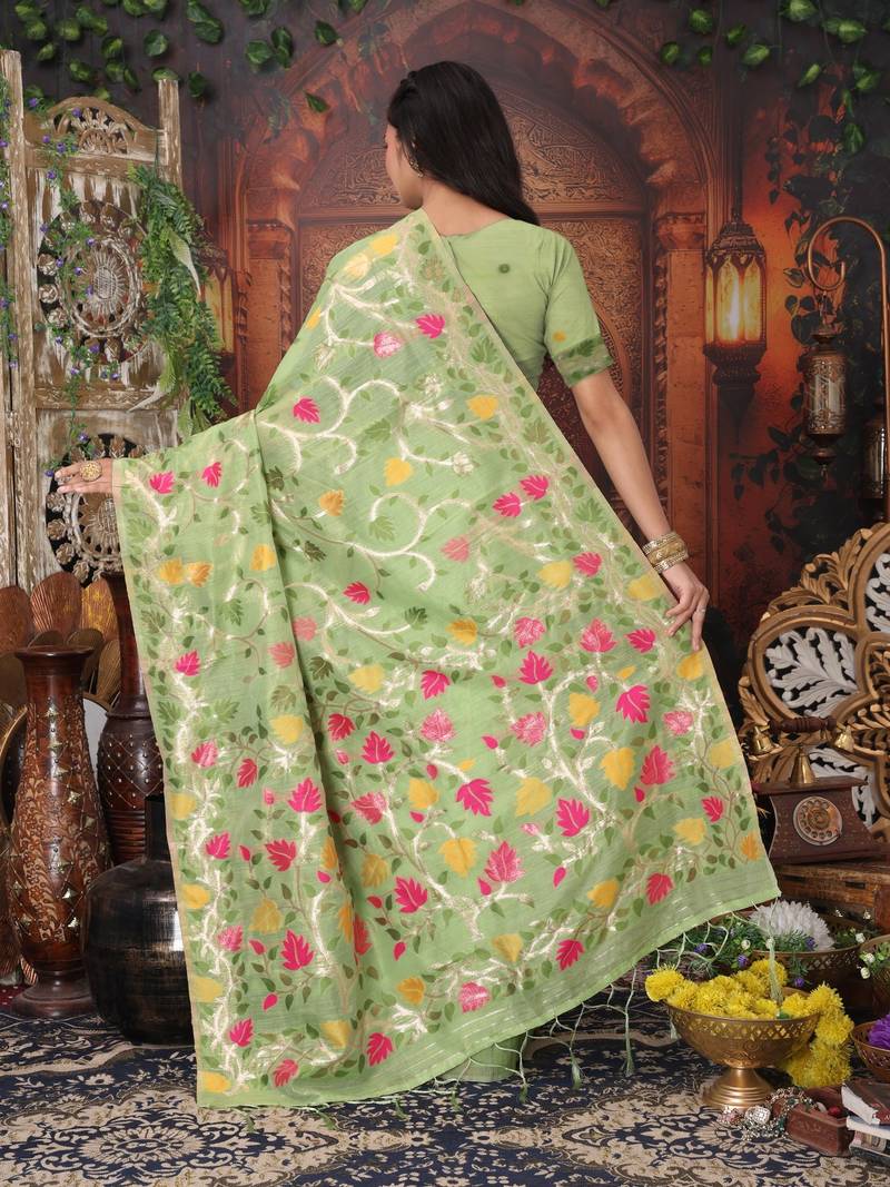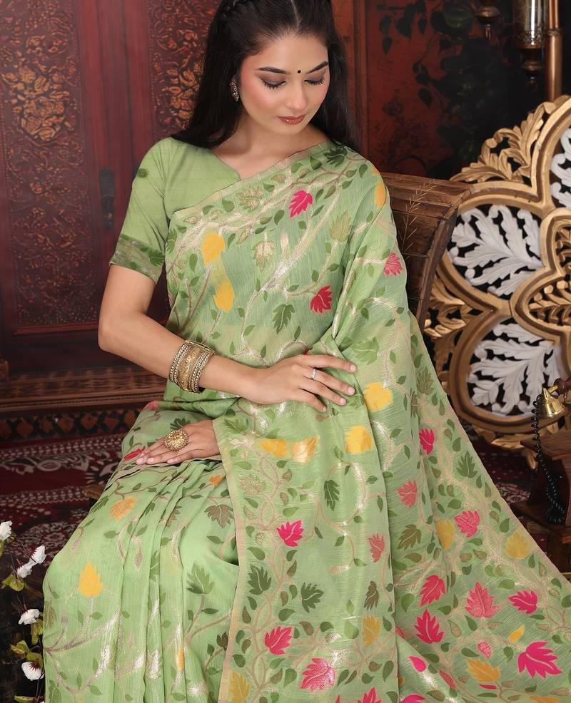 Green linen printed saree with blouse