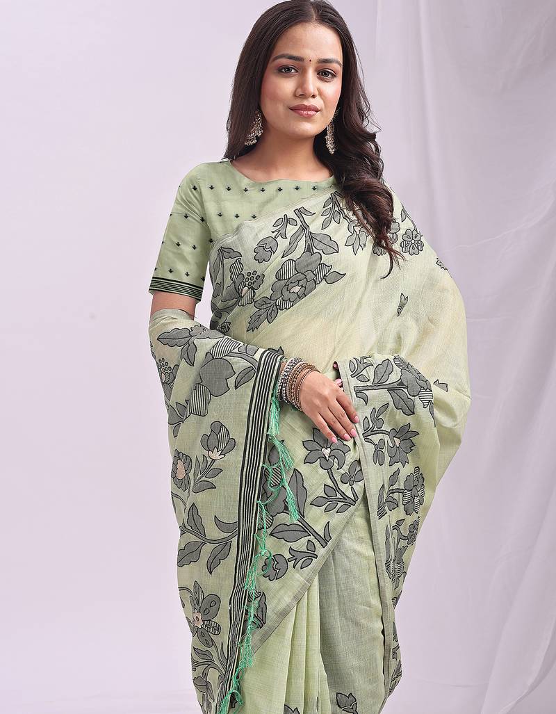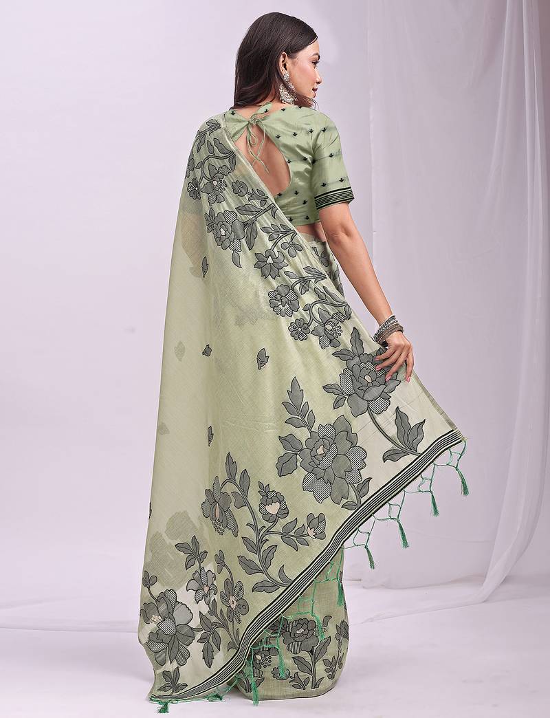 Green linen printed saree with blouse