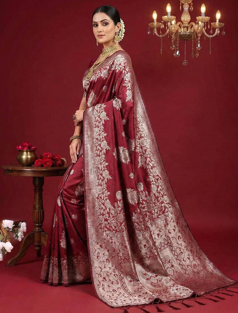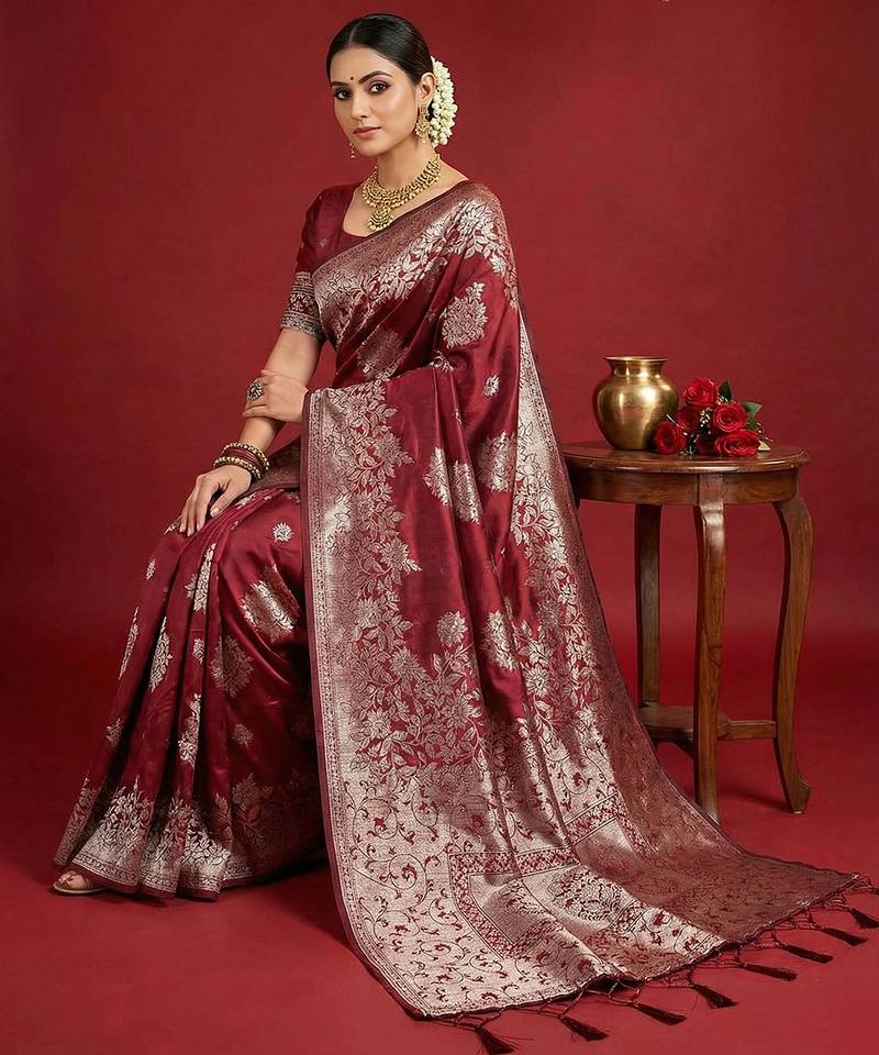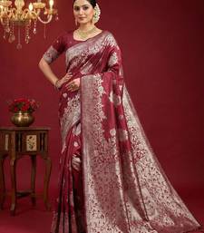 Maroon silk blend woven saree with blouse