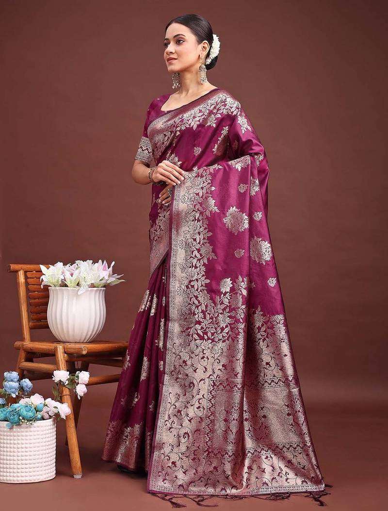 Purple banarasi silk woven work saree with blouse