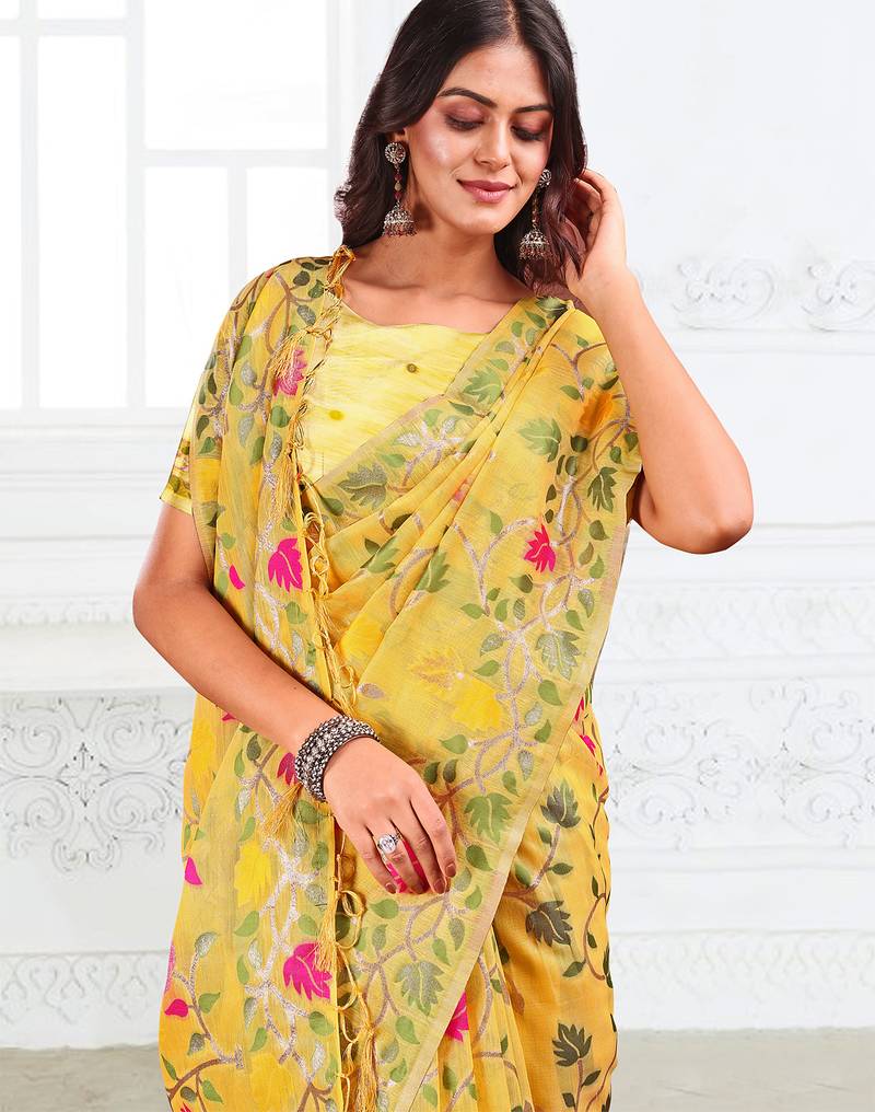 | Product Name | Yellow Linen Printed Saree With Blouse | |
