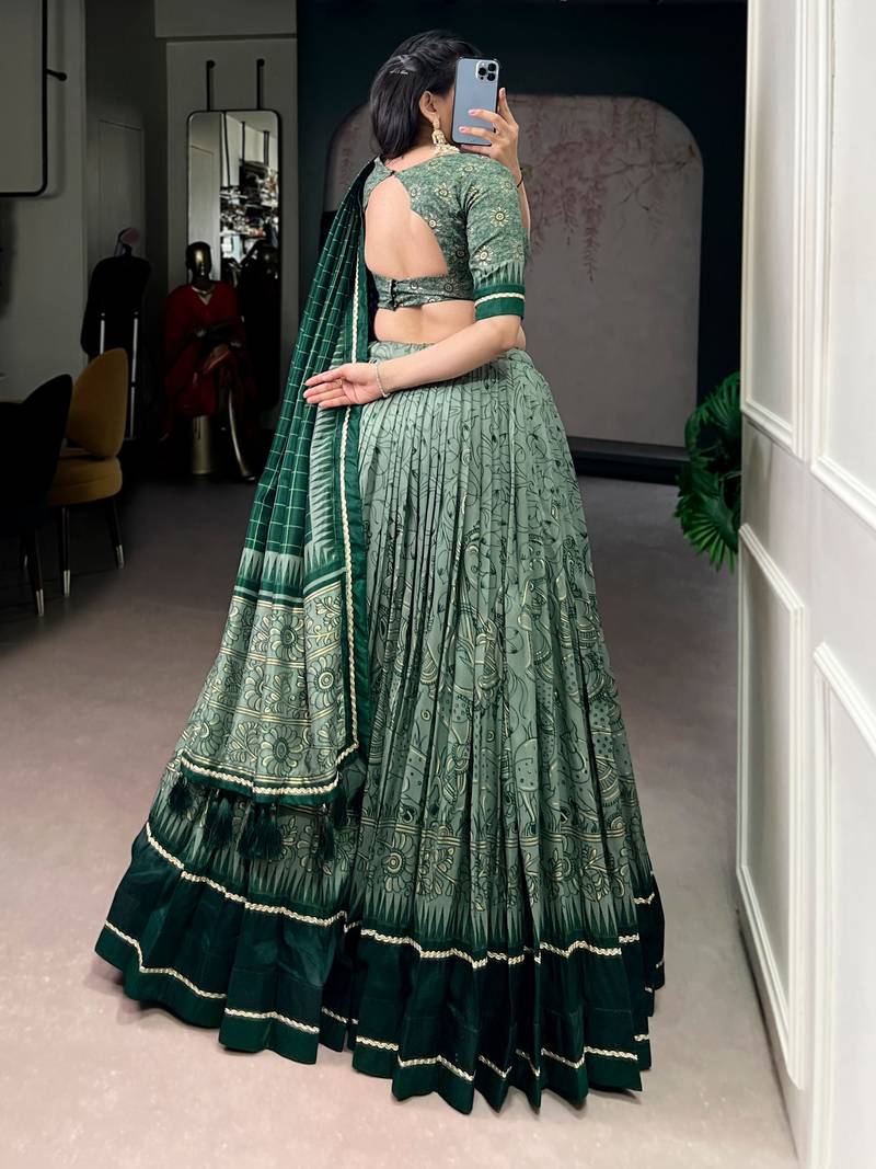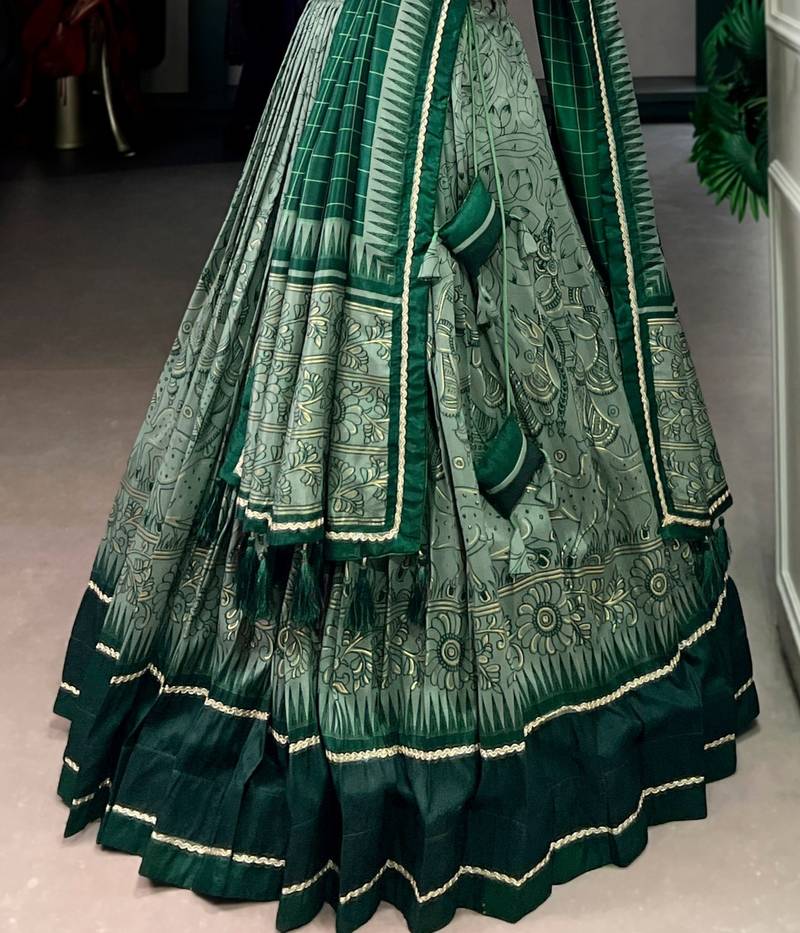 | Product Name | Green Tasar Silk Lehenga Set With Kalamkari Print & Lace Border Includes Blouse & Tassel Dupatta | |