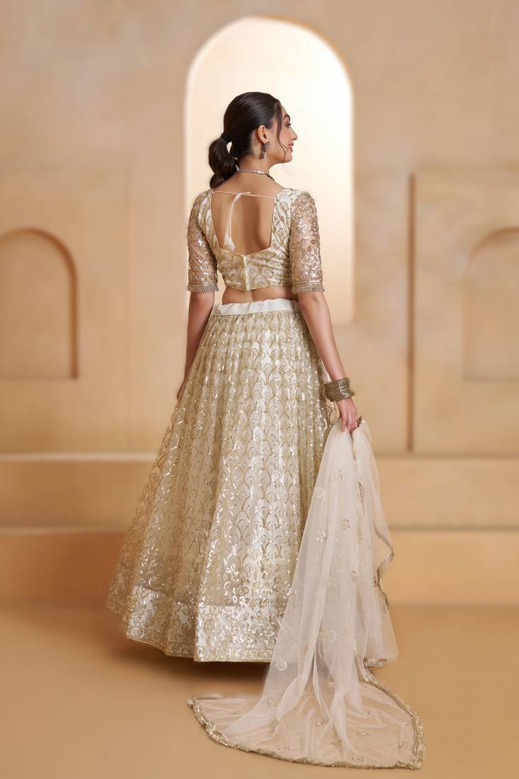 Off white designer butterfly net lehenga choli with fancy lace dupatta