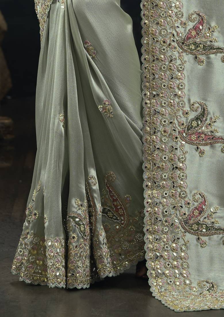 Pista pure ziraf silk saree with zari, cut-dana, moti & mirror work