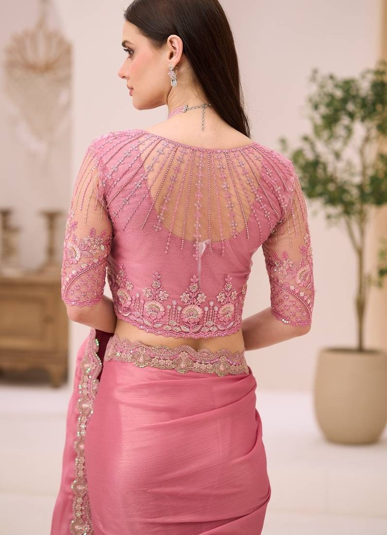 Powder pink shimmer satin saree with jacket style blouse