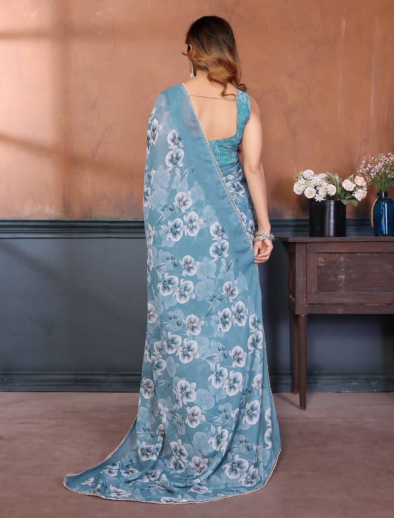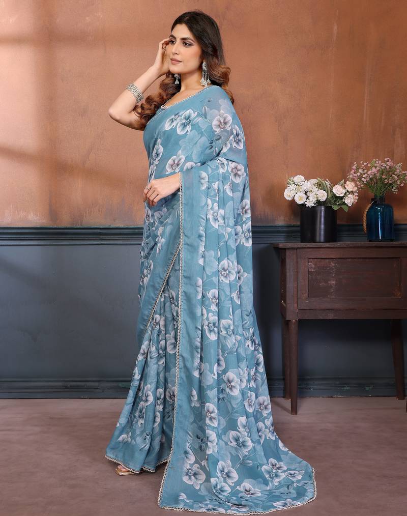 Sky color sharmili georgette silk printed saree with unstitched blouse | rich tone colour designer saree |