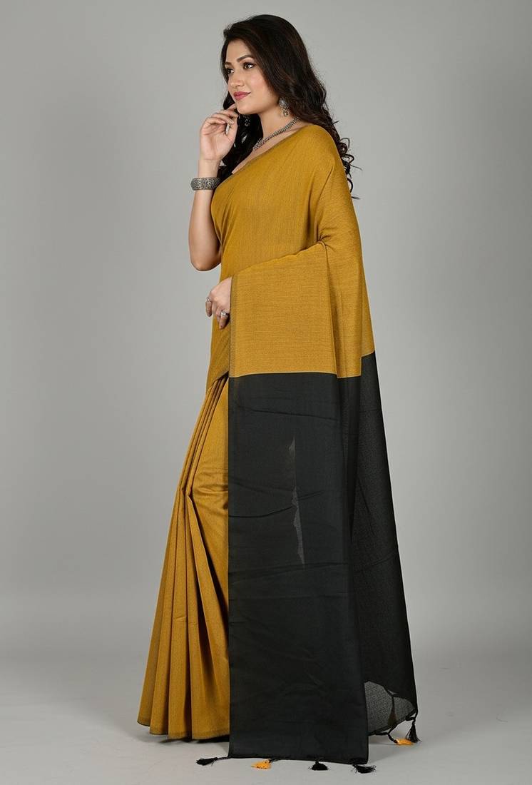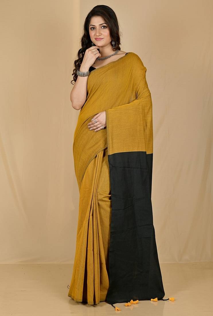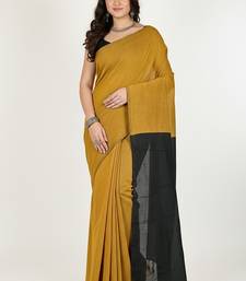 Mustered & black fancy cotton handloom saree with blouse piece for women