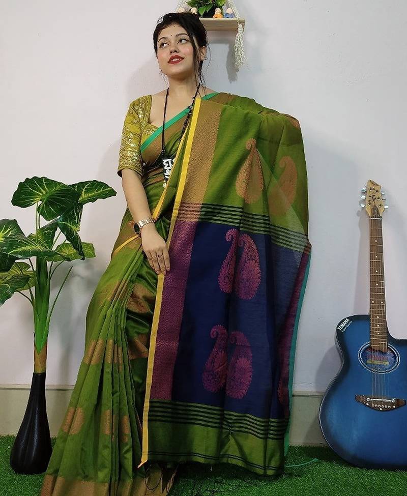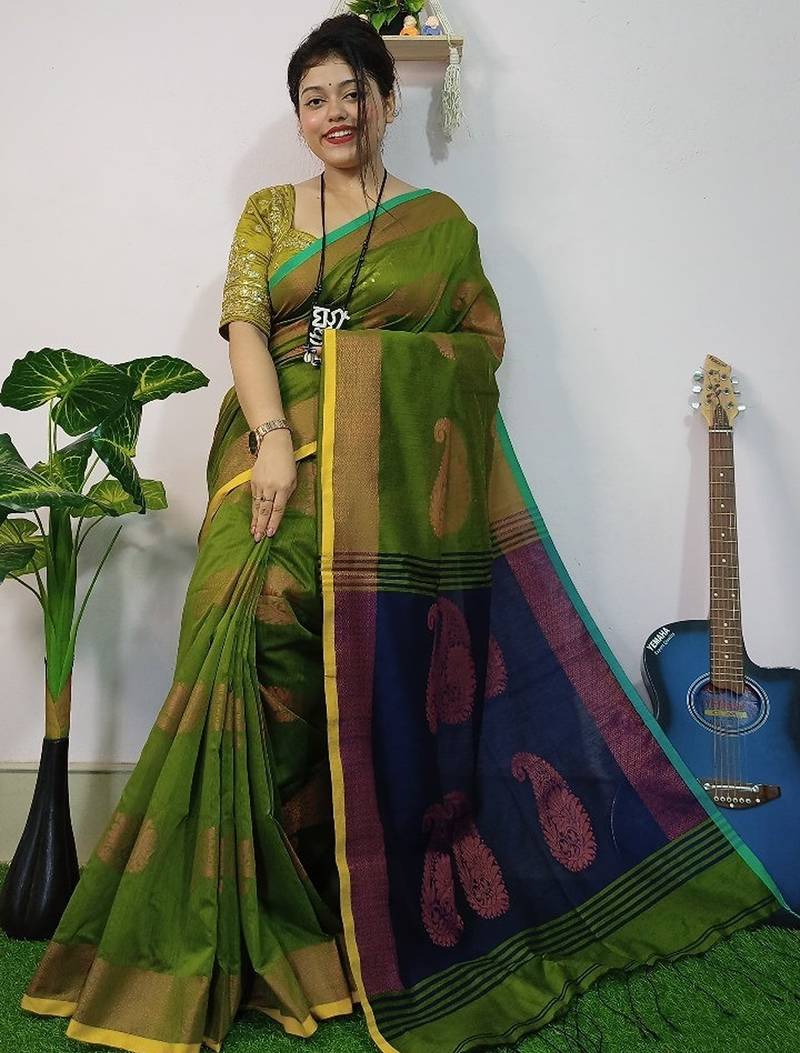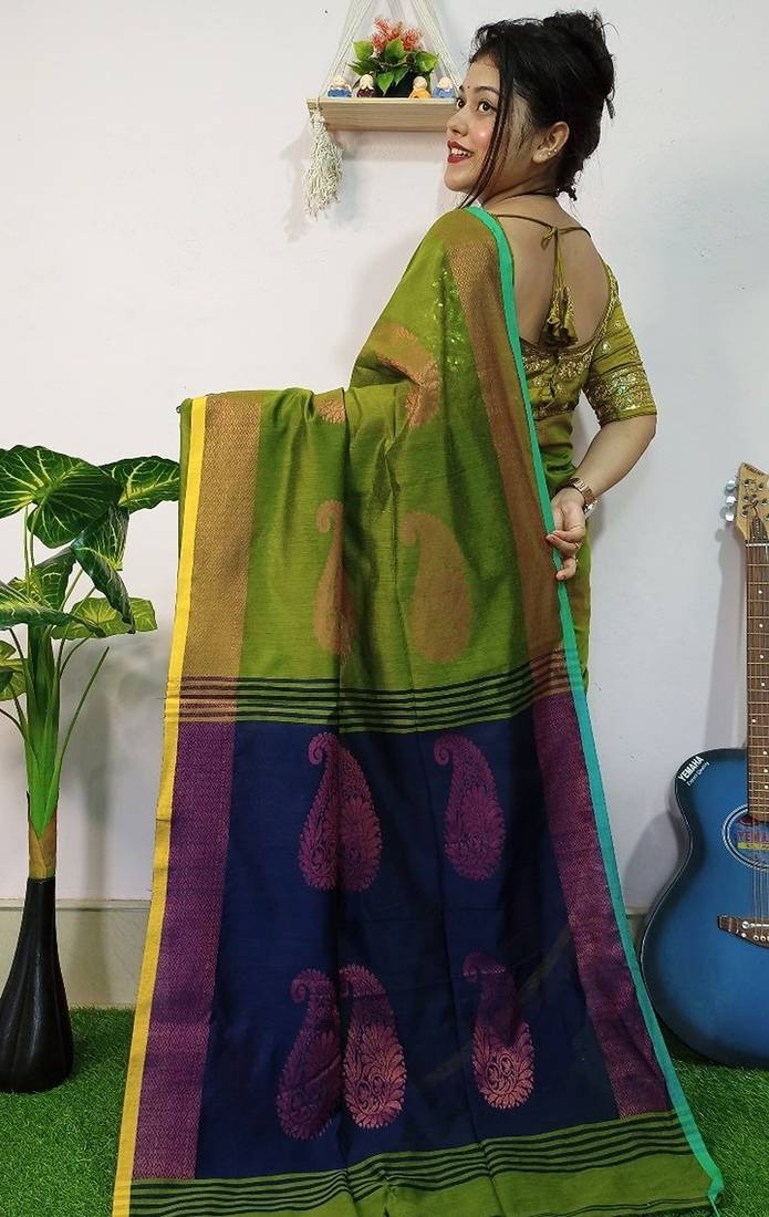 Green & blue fancy cotton handloom saree with blouse piece for women