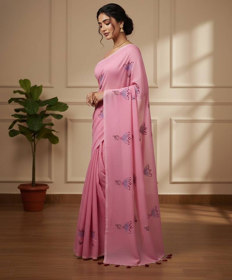 | • | Saree | : | Color- Pink / Fabric- Pure Cotton |