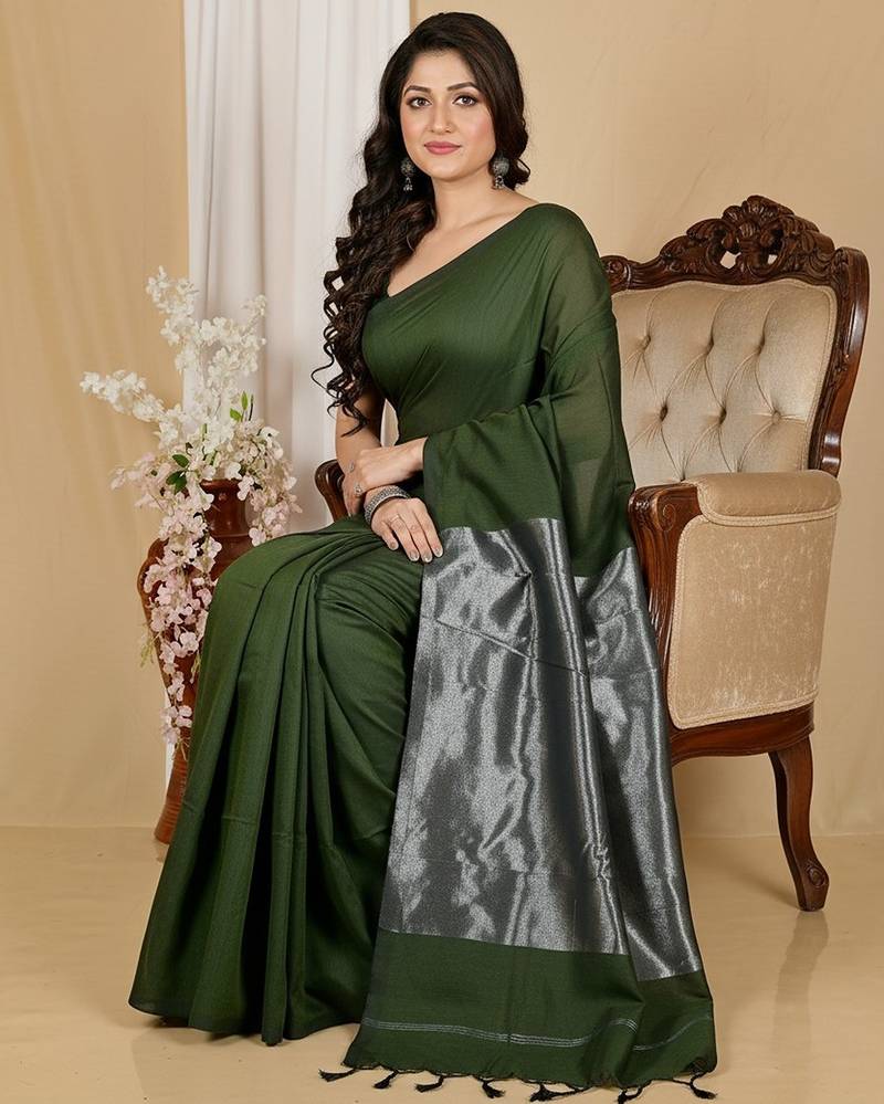 Pista fancy cotton handloom saree with blouse piece for women