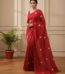 Red fancy cotton handloom saree with blouse piece for women