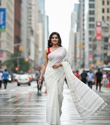 White fancy cotton handloom saree with blouse piece for women