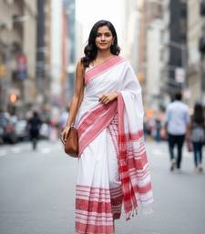 White & red fancy cotton handloom saree with blouse piece for women