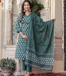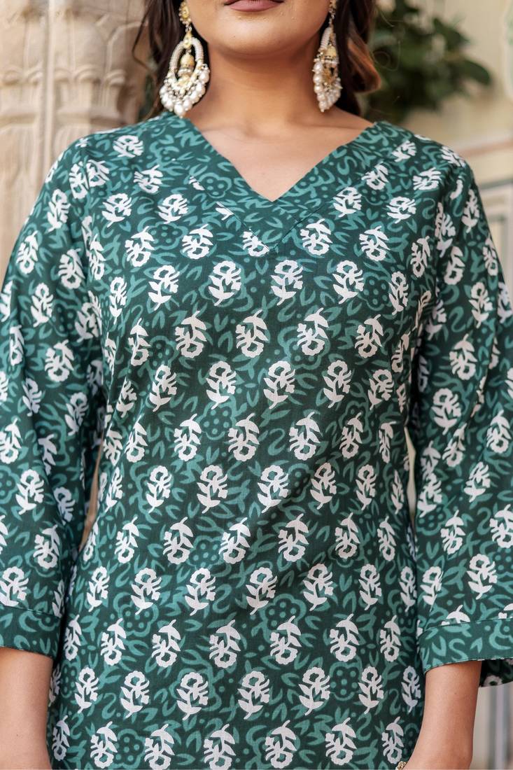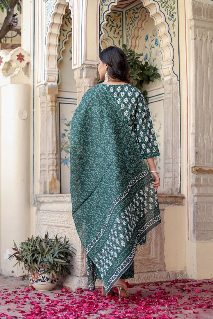 Product Name Dark Green Floral Block Print Cotton Straight Kurta Set With Dupatta