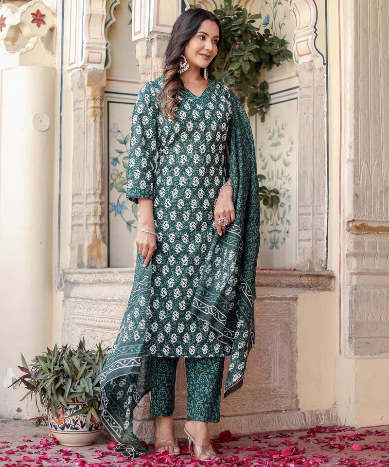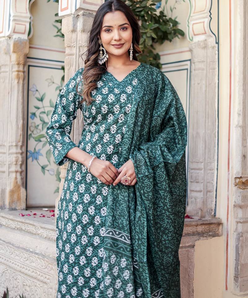 Elevate Your Ethnic Wardrobe With This Rich Dark Green Cotton Kurta Set Featuring Traditional Block Print Patterns. The Straight Silhouette Gives It A Timeless Appeal, While The Printed Dupatta Adds Graceful Detail. Comfortable And Stylish, This Outfit Is Perfect For Festive Days, Casual Gatherings, And Everyday Ethnic Wear.