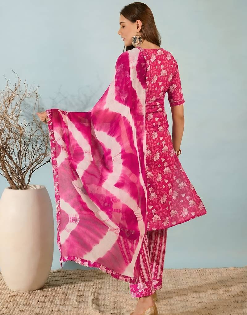Pink floral print cotton blend straight kurta with pant & dupatta ethnic wear set