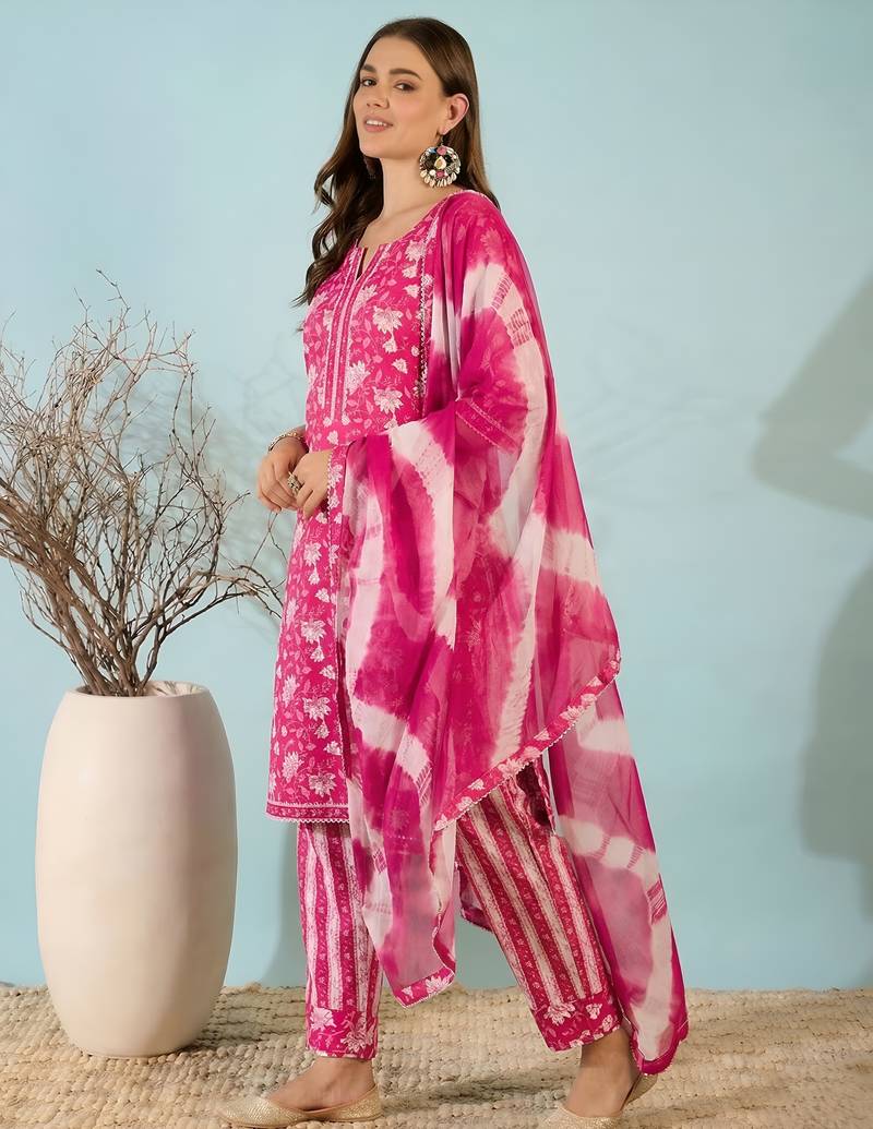 | Product Name | Pink Floral Print Cotton Blend Straight Kurta With Pant & Dupatta Ethnic Wear Set | |