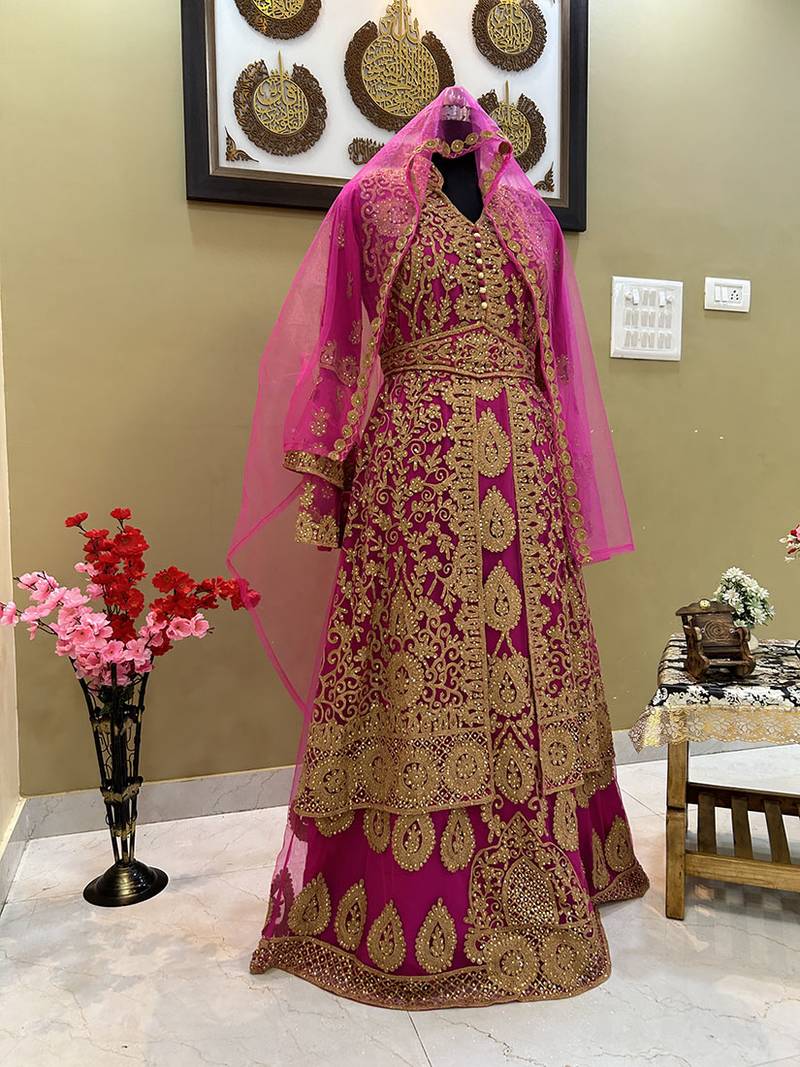 The Vibrant Rani Pink Fabric Is Richly Embellished With Intricate Handcrafted Gold Zari Work And Shimmering Stones, Forming Ornate Traditional Motifs Across The Entire Garment. The Embroidered Bodice Features A Central Opening, While The Flared Skirt Showcases Tiered Embroidery, Often Layered Over An Inner Lining Or Separate Dress. A Coordinating Sheer Net Shawl With Matching Gold Bordered Detailing Completes The Regal Ensemble, Making This Kaftan A Truly Unforgettable Statement Piece.