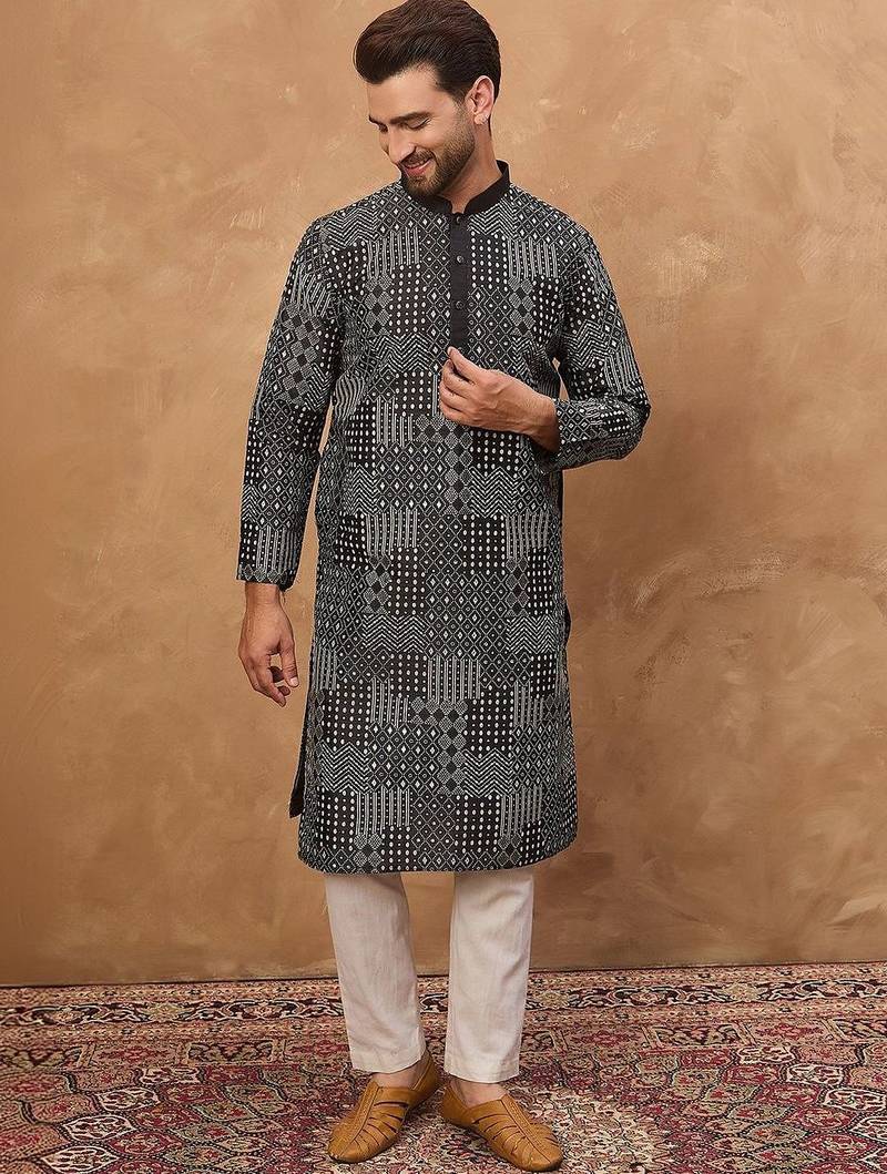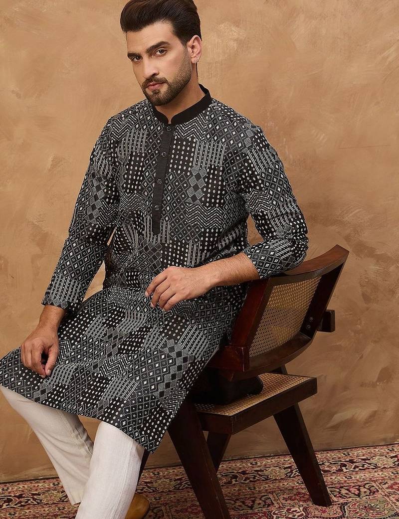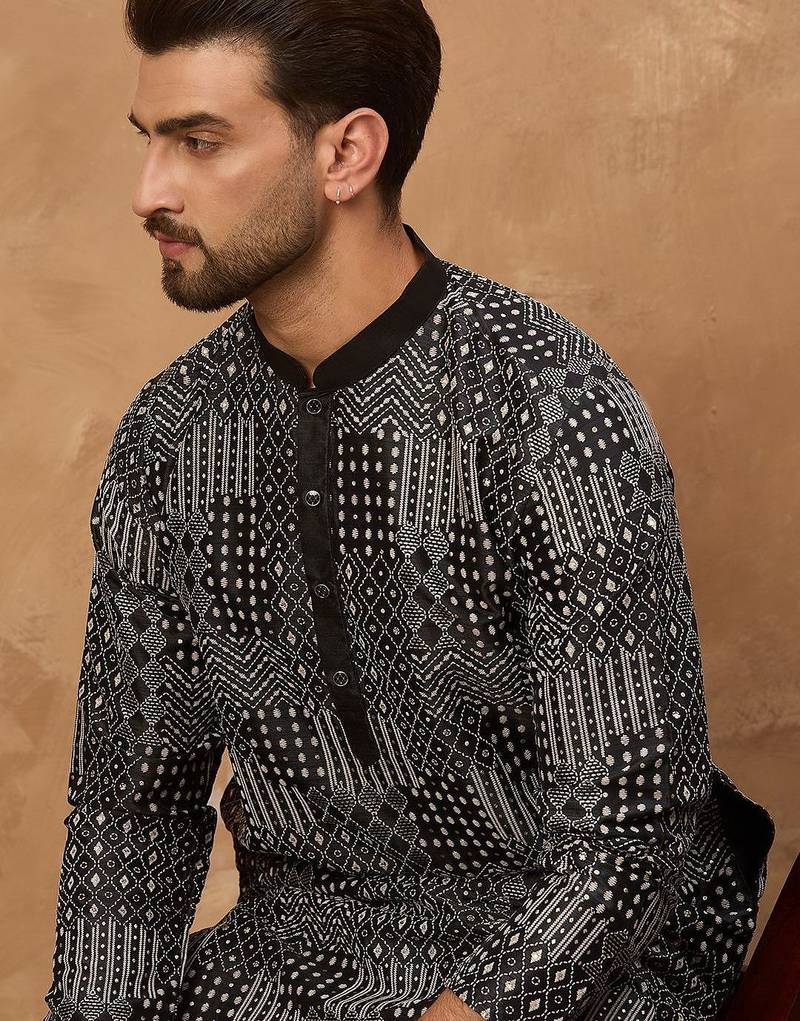 | Product Name | Men Black Silk Blend Geometric Printed Straight Kurta With Pant Set | |