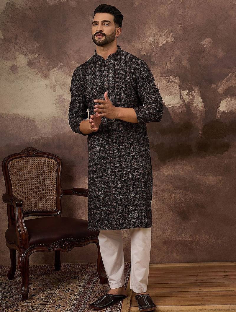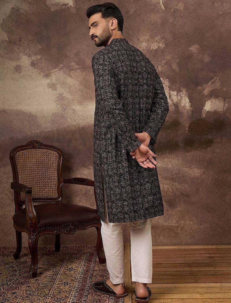 Men black viscose rayon ethnic motifs embroidered straight kurta
