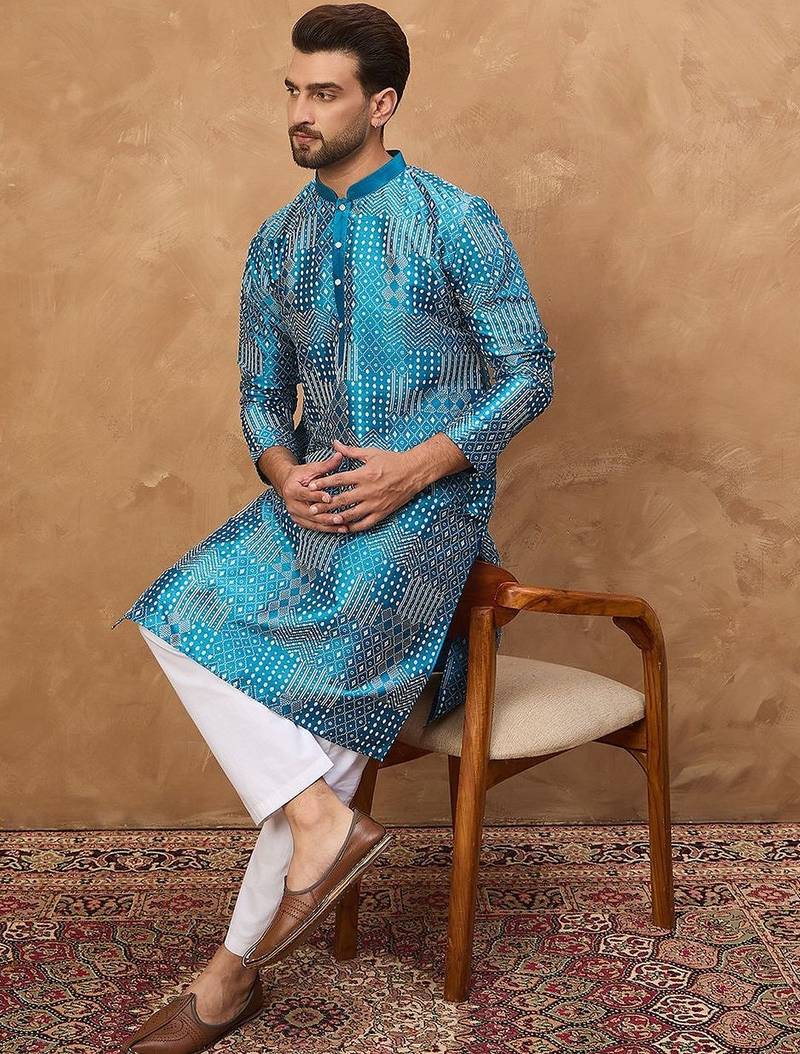 | Product Name | Men Blue Silk Blend Geometric Printed Straight Kurta With Pant Set | |