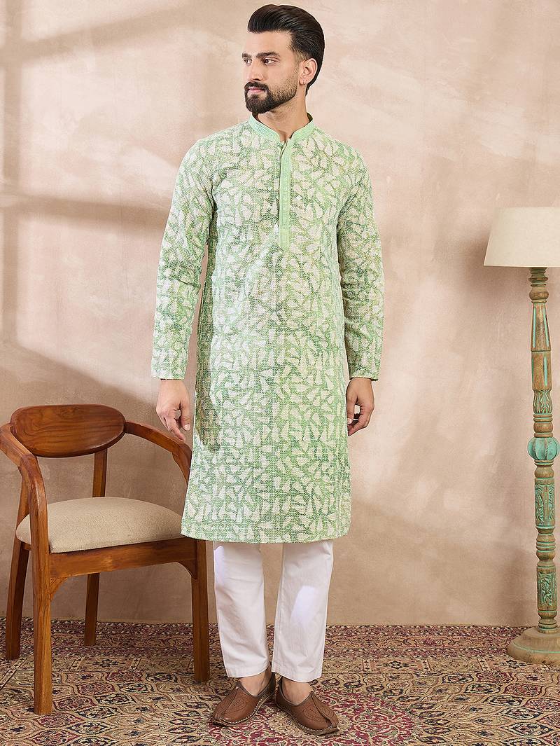 | Product Name | Men Green Viscose Rayon Ethnic Motifs Embroidered Straight Kurta With Trouser | |