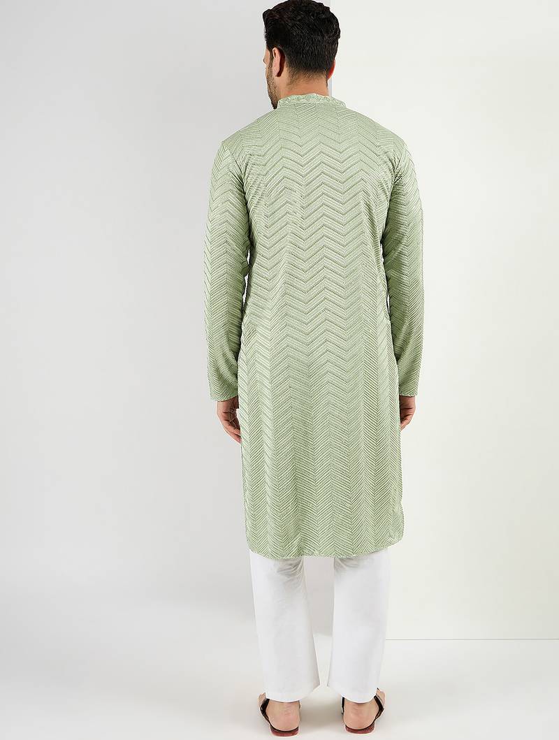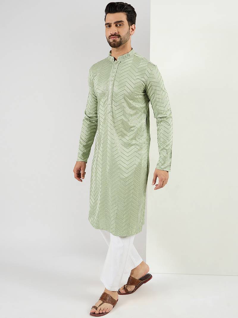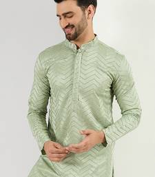 Men green viscose rayon solid embroidered straight kurta